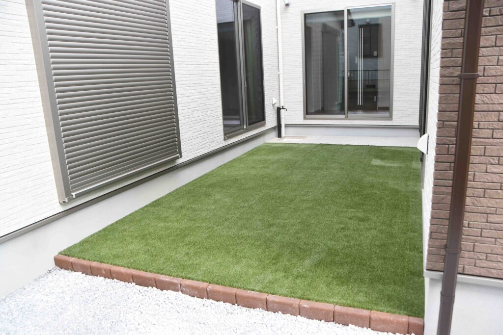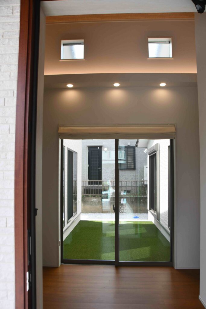 人工芝を敷き詰めた中庭は、家族の憩いの場として最適です。LDKの大きな窓から中庭を望むことで、室内にもたっぷりの陽光と心地よい開放感をもたらします。